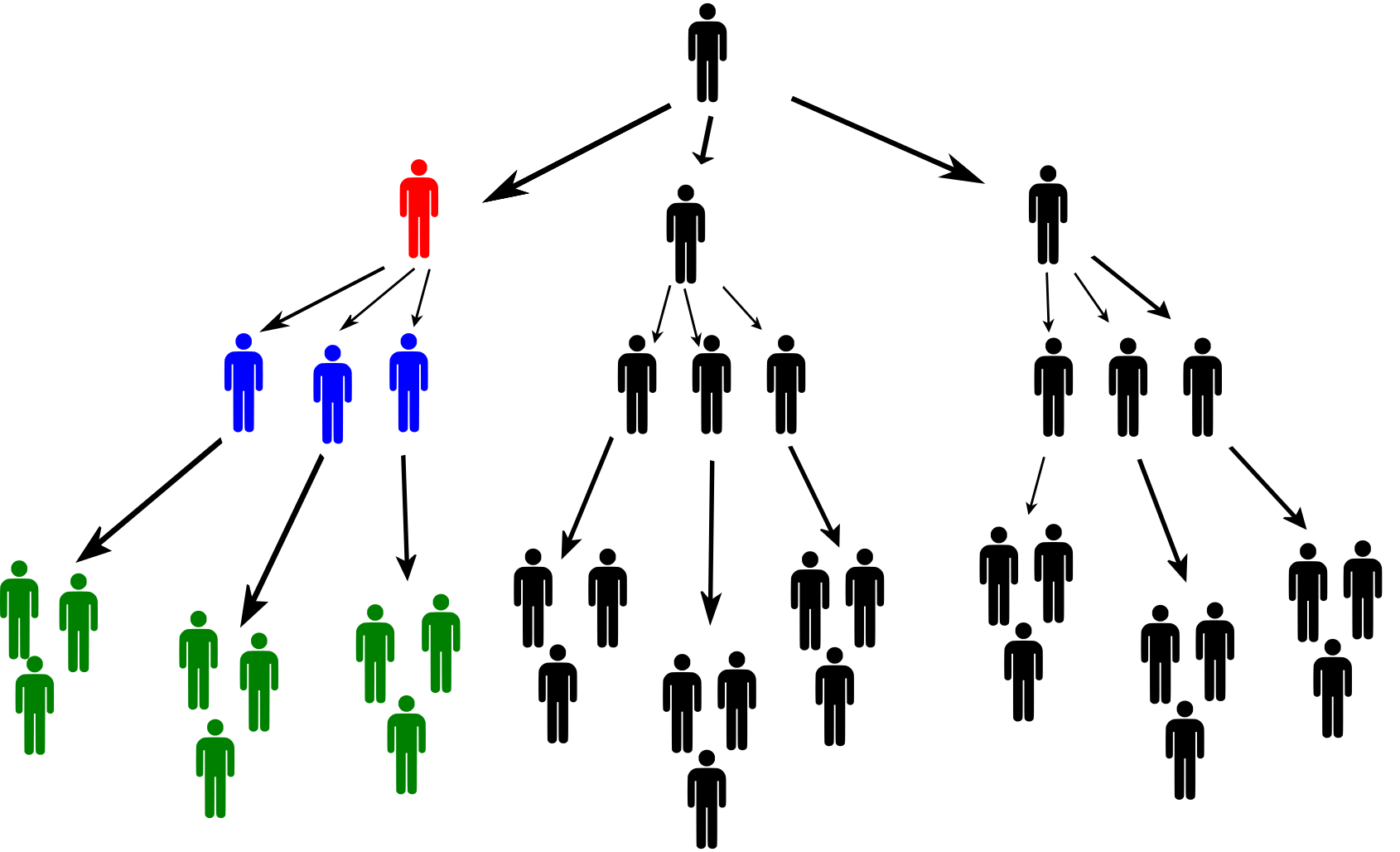 El inversor de color rojo del segundo nivel de la pirámide recibe 6 000 CZK de cada uno de los tres inversores de color azul del tercer nivel. A continuación, estos tres inversores reclutan a otras personas para la estafa. El inversor rojo recauda 1 000 CZK de cada inversor de color verde. Del mismo modo, cobra 1 000 CZK de las personas reclutadas por los inversores de color verde y de todas las demás personas de “su” rama de la pirámide.