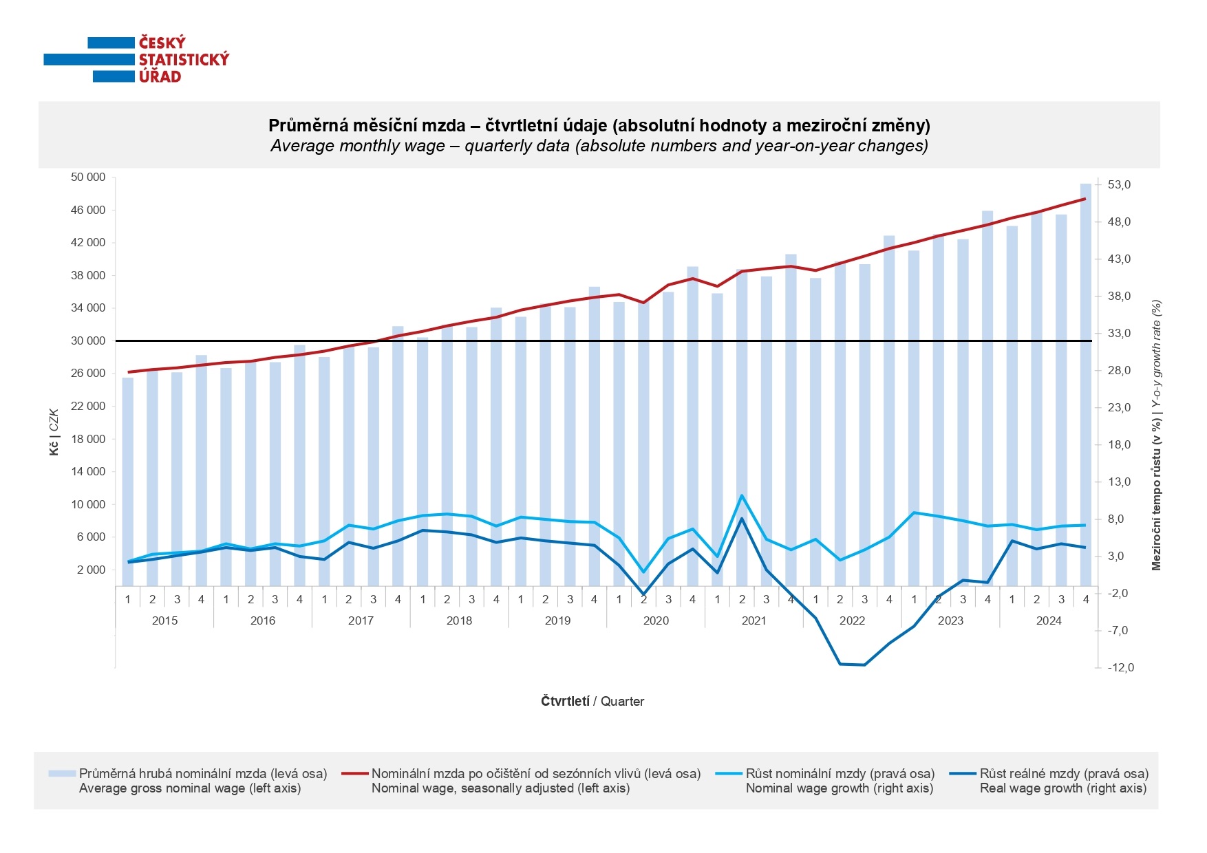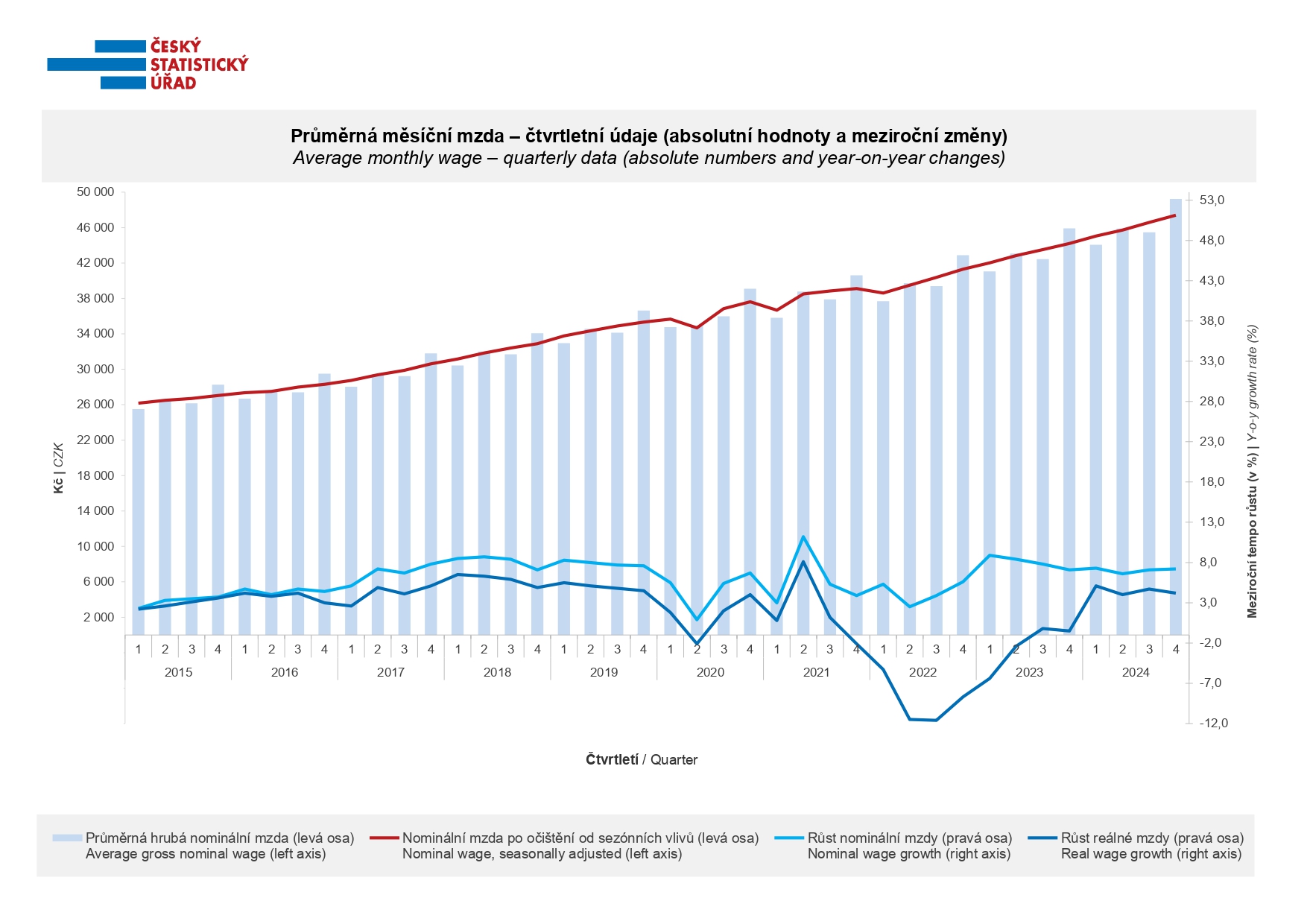 Among the resources provided by the Czech Statistical Office, there is a graph showing the development of the average gross monthly wage, presented in Figure 2. The horizontal axis shows the quarters of the observed years. The blue bars represent the average gross nominal wage at that time, while the red line indicates the trend of the nominal wage adjusted for seasonal effects. Both of these values are read from the left vertical axis in Czech crowns. The light blue line shows the growth rate of the nominal wage (read from the right vertical axis in percent), and the dark blue line shows the growth rate of the real wage (also read from the right vertical axis).