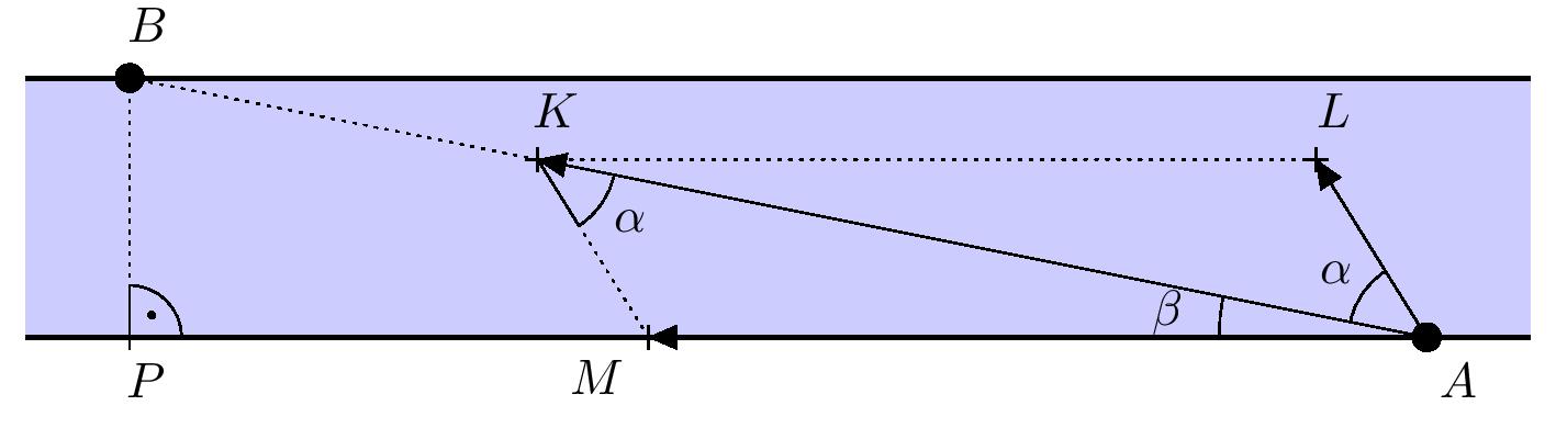 \[ \frac{|KM|}{\sin \beta} = \frac{|AM|}{\sin \alpha} \] \[ \sin \alpha = \frac{|AM|}{|KM|}\cdot \sin\beta \qquad \Rightarrow \qquad \alpha = \arcsin \left( \frac{|AM|}{|KM|}\cdot \sin\beta \right) \] Tras sustituir los valores, obtenemos \(\alpha \doteq 6^{\circ}45'\). Así, el barquero tiene que girar su barco aproximadamente 7^{circ}$ a la derecha desde el rumbo directo al destino.