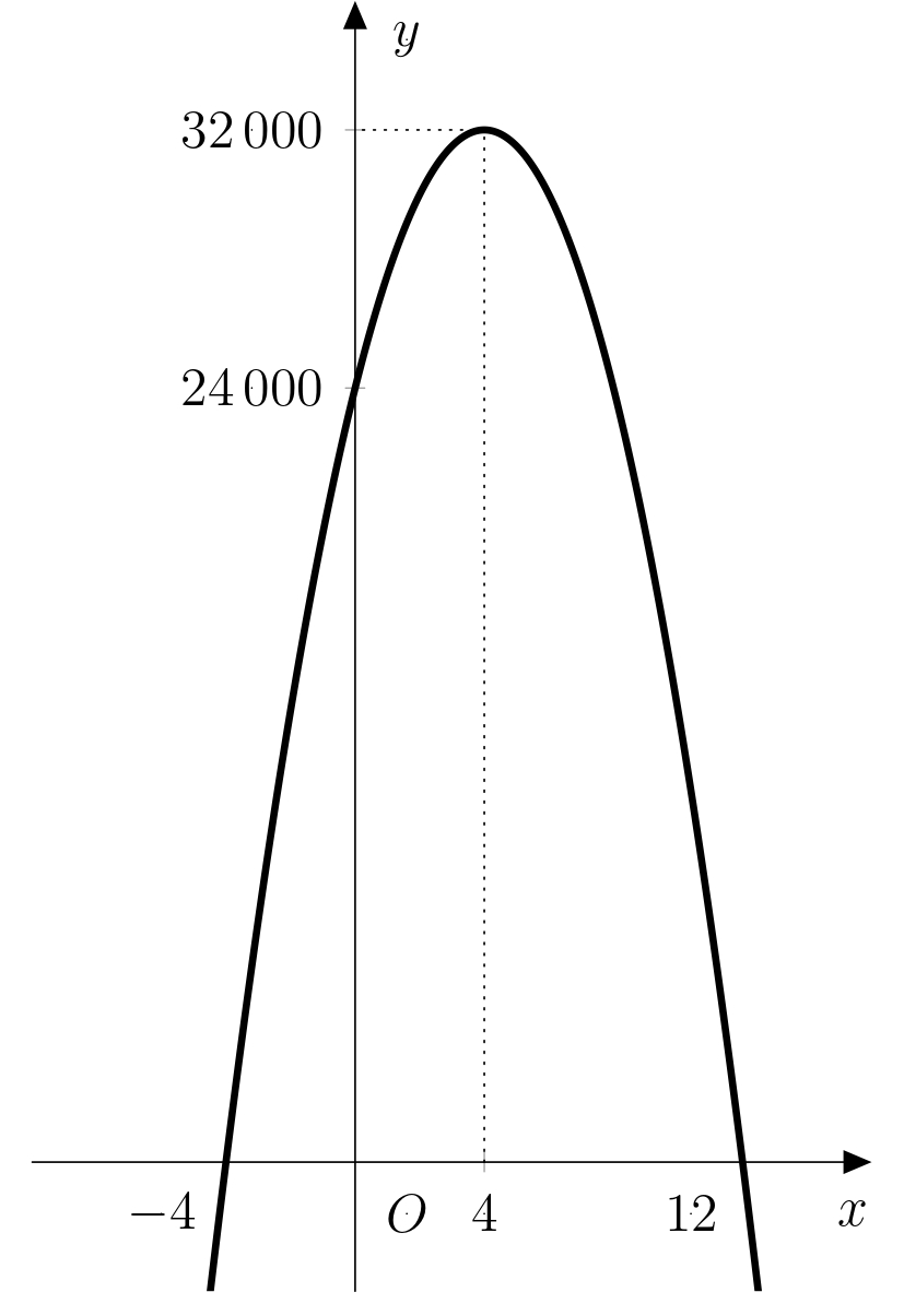 Řešení. Úpravou pravé strany vzorce jej převedeme na tvar \[ y=-500x^2+4\ 000x+24\ 000\ . \] Dostáváme tak kvadratickou funkci, jejímž grafem je parabola. Tato parabola je kvůli zápornému koeficientu u kvadratického členu konkávní.