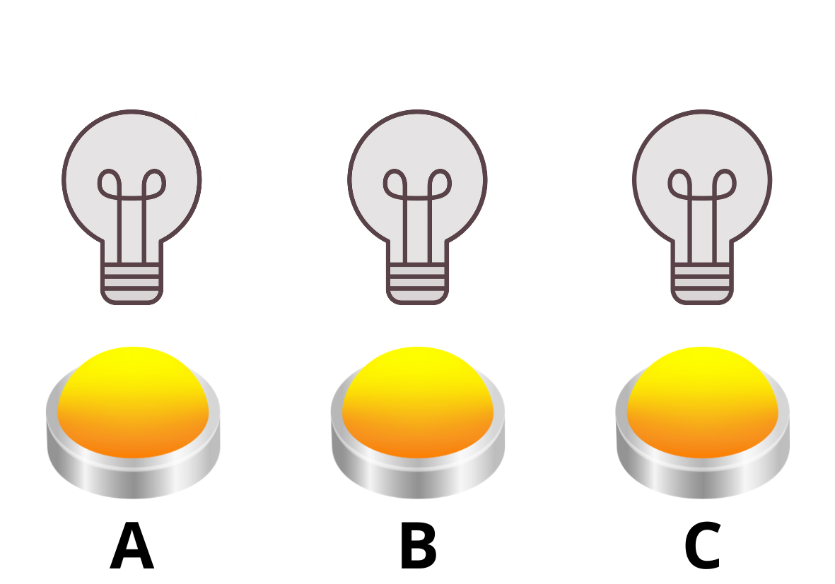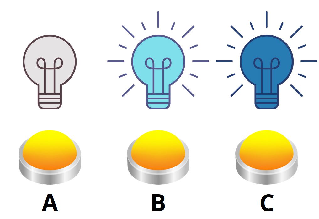 Problema 3. Las nuevas bombillas azules se diferencian de las anteriores en que pueden brillar en dos tonos diferentes de azul. Cuando se apaga esta bombilla, la primera pulsación del interruptor que la controla ilumina en azul claro, la segunda la vuelve azul oscuro y la tercera la apaga de nuevo. Los interruptores siguen teniendo la misma propiedad, es decir, controlan la bombilla que tienen encima y sus vecinas más próximas. ¿Cuántas veces debes pulsar cualquiera de los interruptores A, B y C para apagar todas las bombillas del estado que se muestra en la imagen?