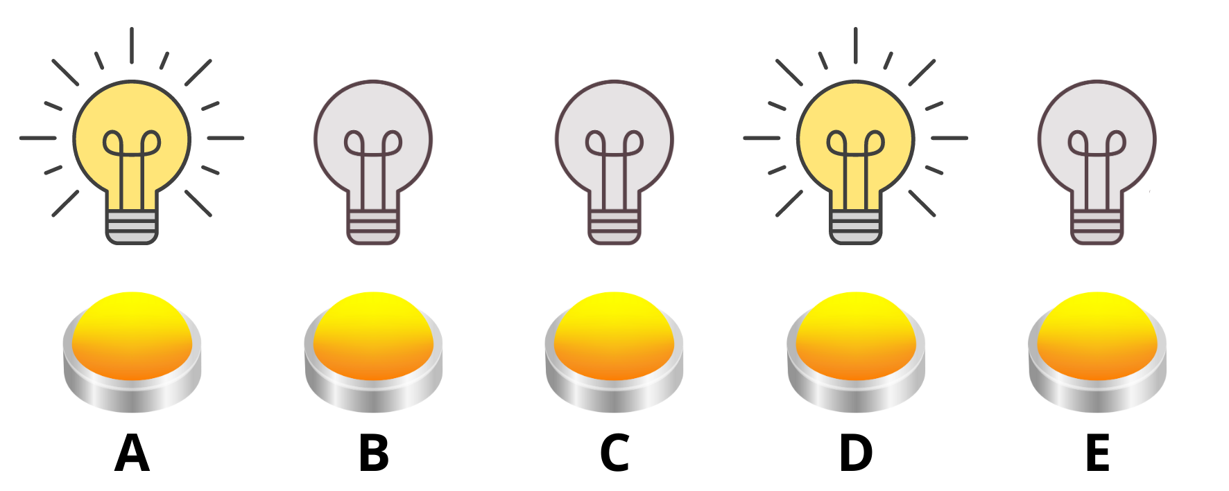 Averigua qué combinación de interruptores debes pulsar para que al final todas las bombillas estén apagadas/sólo la bombilla E permanezca encendida.
