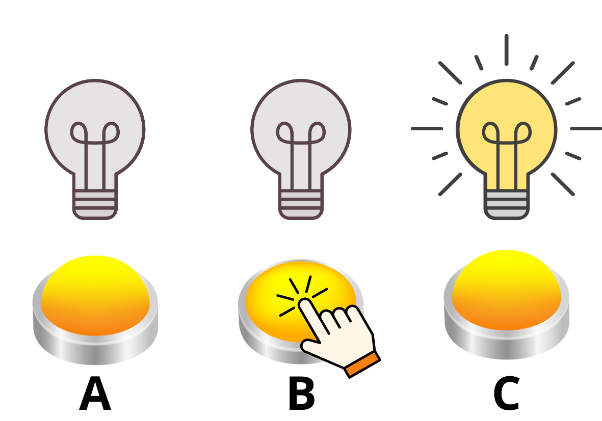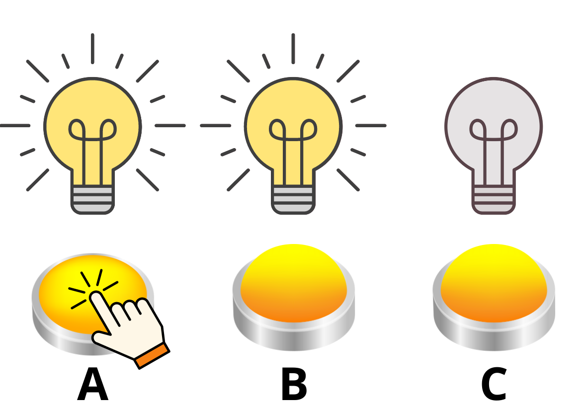En las tres imágenes siguientes, podemos ver cómo las bombillas se encienden y se apagan gradualmente cuando se pulsan los interruptores A y B en secuencia. Es importante señalar que el orden en que se pulsan los interruptores es indiferente. Podemos imaginar que si pulsáramos primero B, se encenderían todas las bombillas, y una pulsación posterior de A apagaría las bombillas A y B, dejando sólo encendida C.