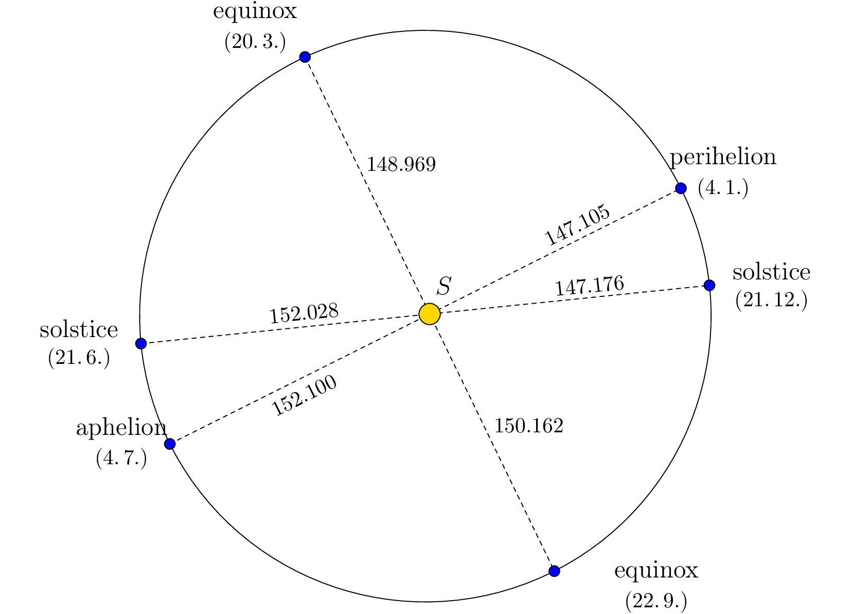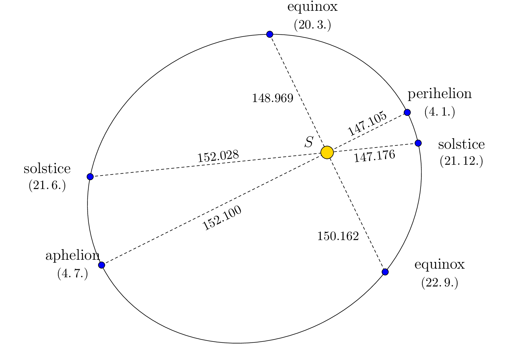 The point on the trajectory where Earth is closest (or farthest) to the Sun is called perihelion (or aphelion). The situation is shown in the following figure, which is intentionally distorted so that the elliptical shape of the trajectory is visible. Distances are given in millions of kilometers, based on data from the Stellarium program, and correspond to the year 2022.