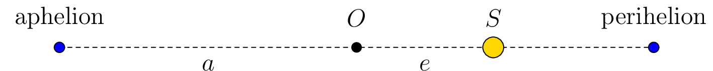 As seen in the figure (where point \(O\) represents the center of the ellipse), the difference between the distance from the Sun to Earth at aphelion and the length of the semi-major axis \(a\) gives the eccentricity \(e\). Thus