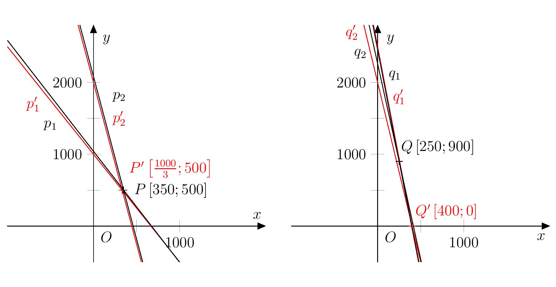 Riešenie. Nech \(p_1\), \(p_2\) (alebo \(q_1\), \(q_2\)) sú priamky dané rovnicami sústavy s nezaokrúhlenými koeficientmi v Úlohe 1 (alebo Úlohe 2), teda \[ \begin{aligned} p_1 &\colon 597x + 386 y = 401\,950 \\ p_2 &\colon 86x + 19 y = 39\,600 \\[2mm] q_1 &\colon 504x + 81 y = 198\,900 \\ q_2 &\colon 98x + 18 y = 40\,700. \end{aligned} \] Priamky dané príslušnými rovnicami so zaokrúhlenými koeficientmi označme \(p'_1\), \(p'_2\), \(q'_1\) a \(q'_2\) a ďalej označme priesečníky \(P\in p_1\cap p_2\), \(P'\in p'_1\cap p'_2\), \(Q\in q_1\cap q_2\) a \(Q'\in q'_1\cap q'_2\). Grafické znázornenie dvojice sústav pre každú úlohu samostatne je na nasledujúcom obrázku.
