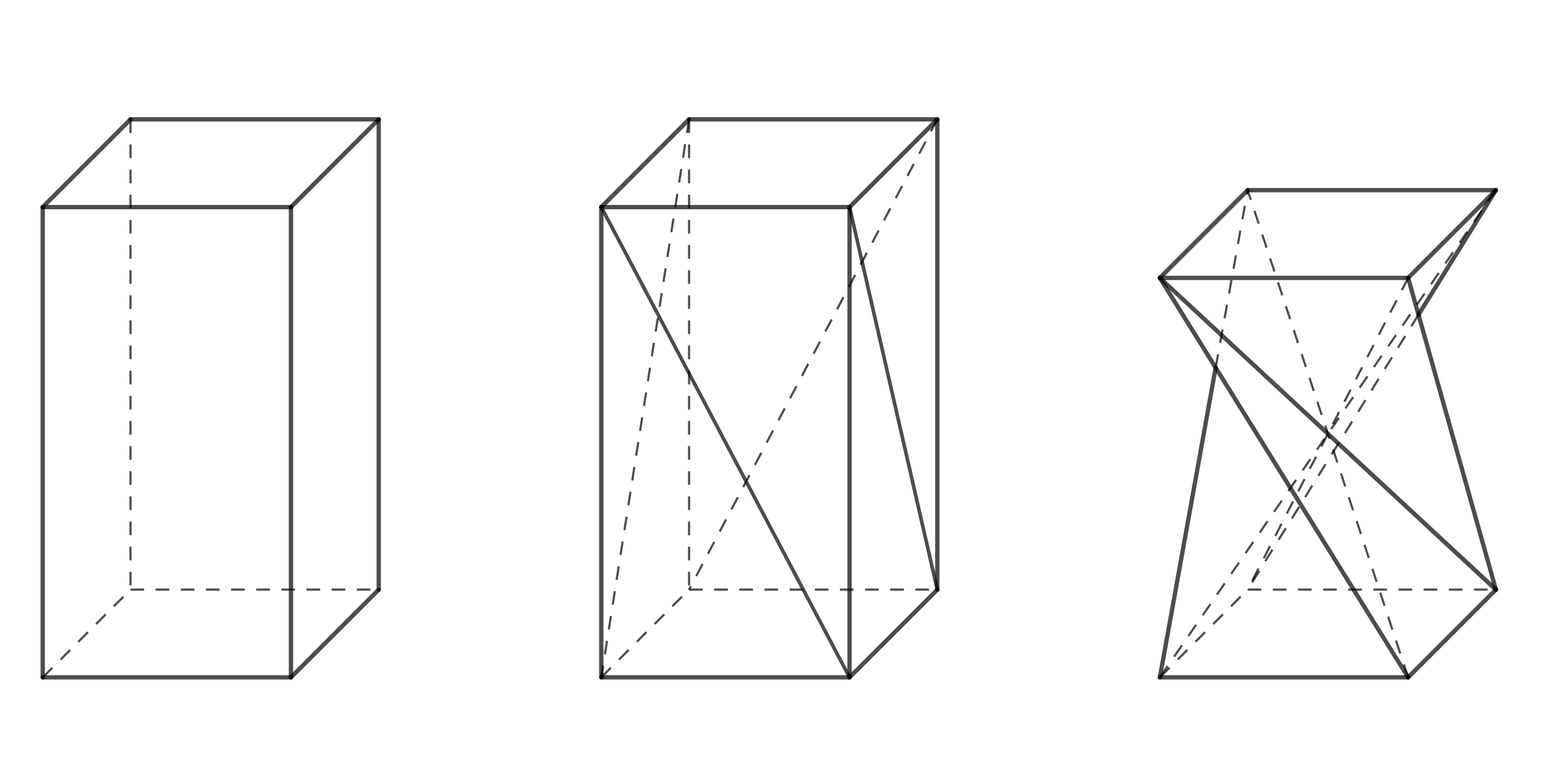 Solution. In Exercise 1, we must have \(v\) greater than \(a\). If \(v = a\), the hypotenuse of the right triangle would be the same length as one of the legs, and the other leg would have zero length. The height of the twisted prism would therefore be zero, and the prism would collapse into a flat shape. The diagonals of the original prism would still intersect at a single point.