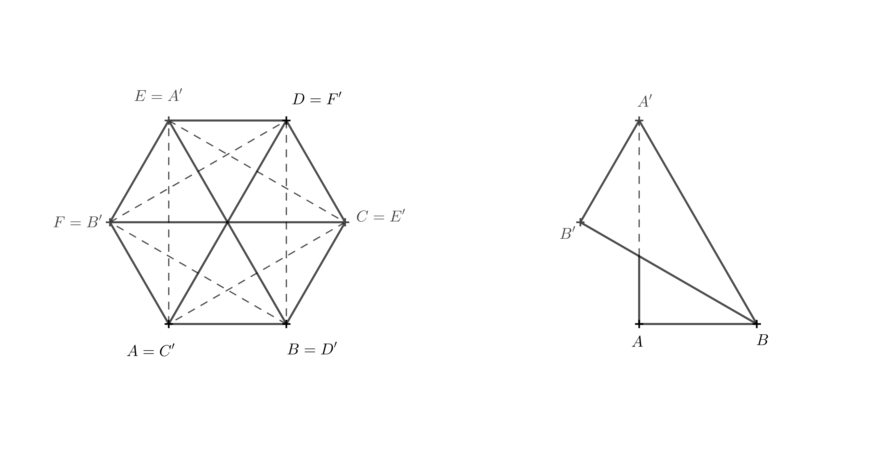 For the segment to pass through the center, point \(A'\) must coincide with point \(E\), because point \(E\) lies opposite point \(B\). We complete the remaining vertices in alphabetical order, following the same direction used in the bottom base — that is, counterclockwise.
