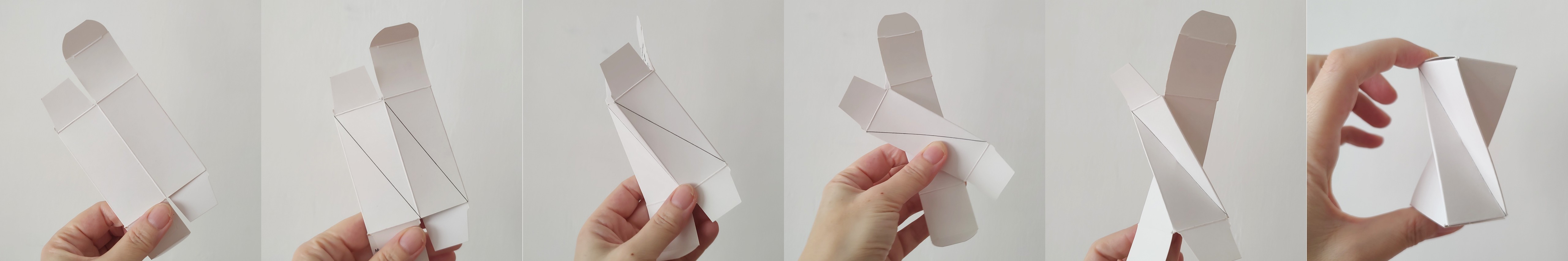 Let’s try creating this shape using, for example, a box from children’s cough syrup or eye drops. For it to work properly, the box’s lids (the top and bottom bases of the prism) must be square and able to be opened or unfolded in some way. Creating a twisted prism requires a bit of practice and skill, because performing a \(90^\circ\) twist is not so easy in reality.