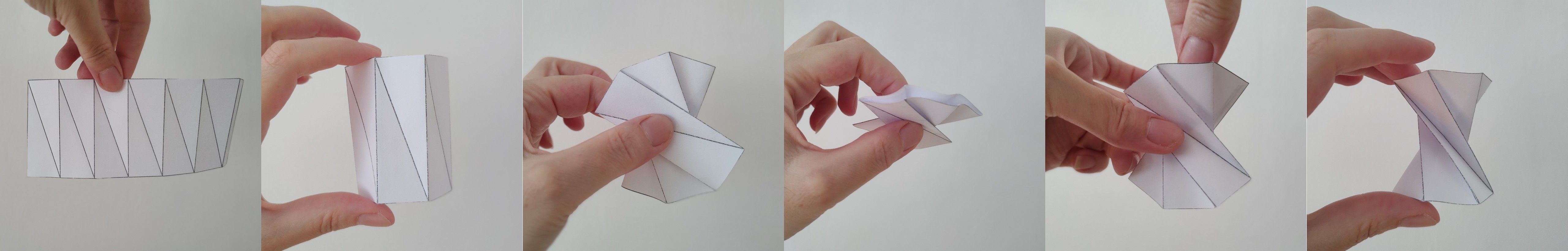 It was already mentioned that the construction method described above does not work in the same way for odd values of \(n\). However, the only difference is that once the net of the prism’s lateral surface is prepared, it is not a good idea to glue the side edge before shaping the prism. Instead, first fold the net into the shape of a twisted prism, and only then glue the side edge.