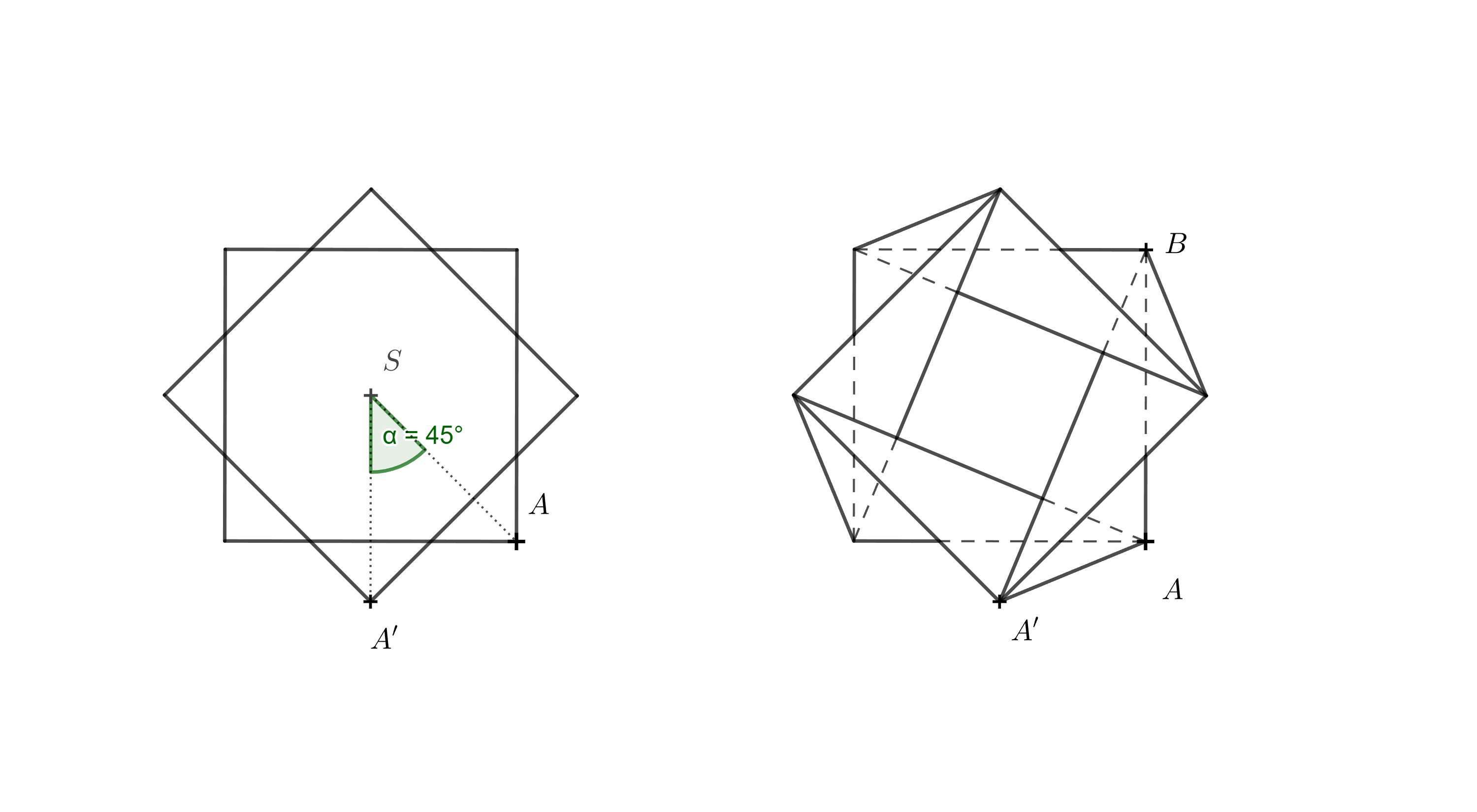 Hint. The left diagram shows a top view of the bottom base and the top base rotated by \(45^\circ\). On the right, all edges of the resulting solid are also shown. You do not need to draw all of them — for the construction, the line segments \(AA'\) and \(BA'\) are the most important. It is also important to realize that in the top view, the orthogonal projection \(A_1\) of point \(A'\) onto the plane of the bottom base satisfies \(A_1 = A'\).