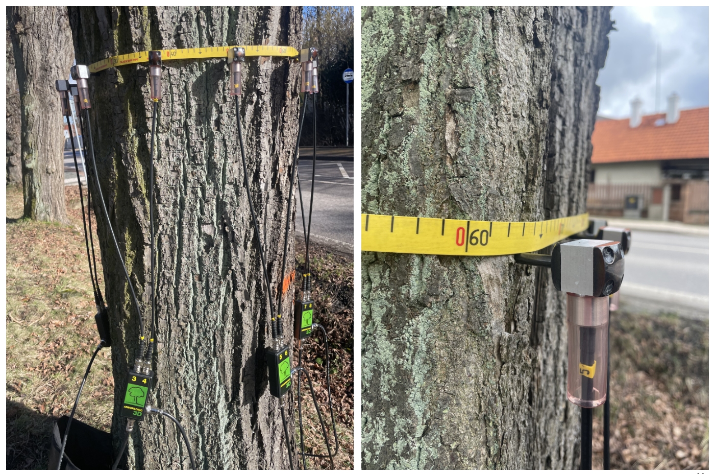 El tomógrafo de árboles funciona según el principio de transmisión del sonido Los sensores se colocan a cierta altura a lo largo de la circunferencia del tronco del árbol en clavos. Las púas atraviesan la corteza del árbol hasta llegar a la madera. Se colocan siempre en el tejido vegetal activo. Aquí el árbol puede regenerarse muy rápidamente, por lo que estos clavos no lo dañarán en modo alguno.