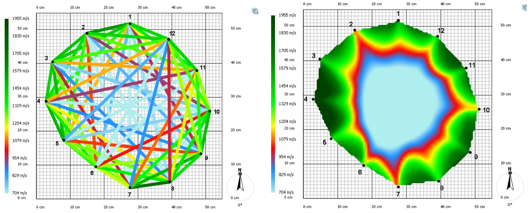 A partir de las velocidades de transmisión del sonido medidas, puede construirse el denominado gráfico de velocidad (véase la figura 3). El color de las líneas que conectan los puntos individuales es importante. Indica la velocidad a la que la señal sonora ha viajado de un punto a otro. A continuación, el programa informático utiliza las velocidades medidas para construir el tomograma resultante. Se trata de una imagen bidimensional, que muestra zonas con diferentes características de transmisión del sonido.
