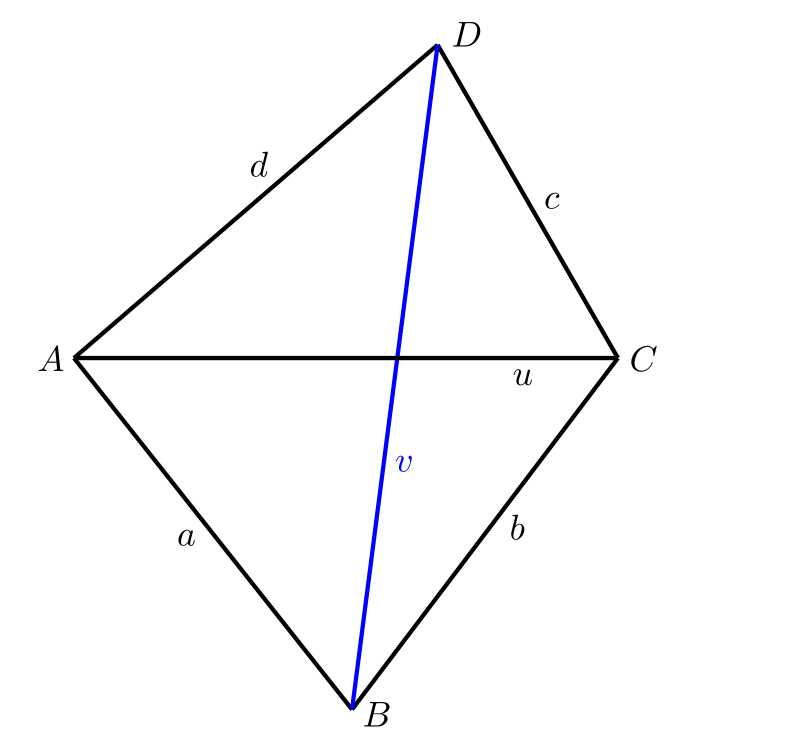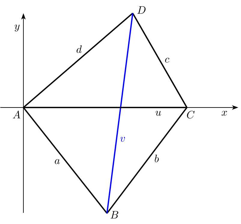 Tarea 1. Consideremos el cuadrilátero genérico \(ABCD\). En este cuadrilátero conocemos las longitudes de los 4 lados \(a\), \(b\), \(c\), \(d\) y la longitud \(u\) de una diagonal \(AC\). La longitud \(v\) de la diagonal \(BD\) ya es demasiado grande y no se puede medir