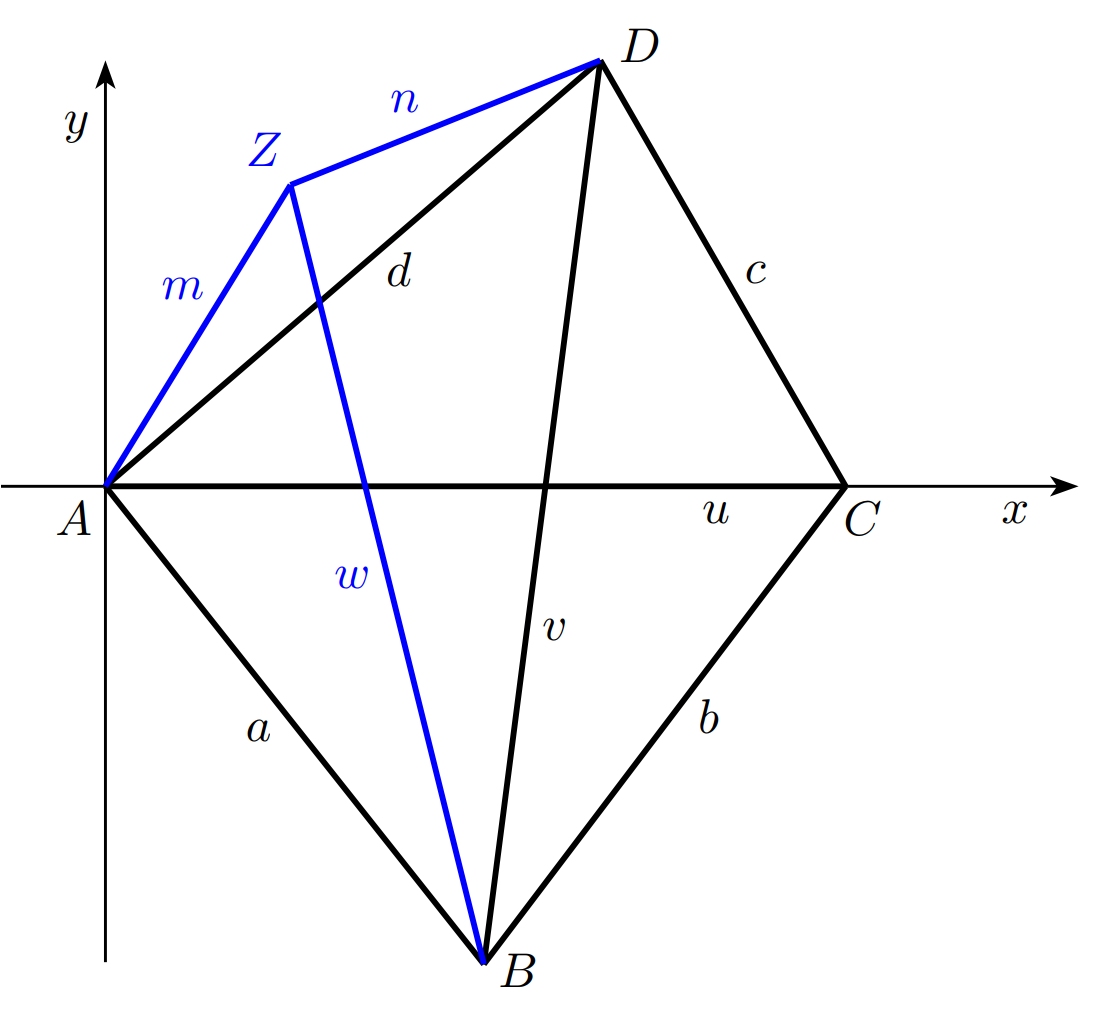 Solución. El procedimiento será el mismo que en la tarea 2, pero utilizaremos el cuadrilátero \(ABDZ\).En este cuadrilátero conocemos las longitudes de todos los lados (indicamos la longitud del lado \(DZ\) por \(n\), la longitud del lado \(ZA\) por \(m\)) y la longitud de la diagonal \(AD\). El problema es determinar la longitud de la segunda diagonal, marquémosla como \(w\).