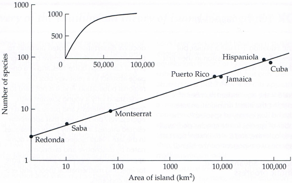 Ponieważ zależność (1) jest funkcją potęgową o wykładniku niecałkowitym, zależność między obszarem ekosystemu a liczbą gatunków nie jest łatwa do zidentyfikowania na podstawie zmierzonych lub zaobserwowanych danych. Niemniej jednak, znajomość tej zależności funkcjonalnej jest ważna. Jest ona przydatna na przykład w ochronie przyrody. Należy zauważyć, że w kontekście biogeografii wysp termin wyspa oznacza w rzeczywistości uogólnioną wyspę. Pod pojęciem wyspy nie rozumiemy tylko lądu otoczonego morzem, ale każdy obszar umieszczony na obszarze innego typu. Na przykład wyspą może być jezioro na lądzie, mały las w krajobrazie rolniczym lub obszar chronionego krajobrazu otoczony ziemią o normalnym reżimie. Wiedza o tym, w jaki sposób wielkość obszaru wiąże się ze składem gatunkowym i różnorodnością, jest ważnym czynnikiem przy podejmowaniu decyzji o budowie jednego dużego rezerwatu przyrody lub kilku małych w celu ochrony przyrody.