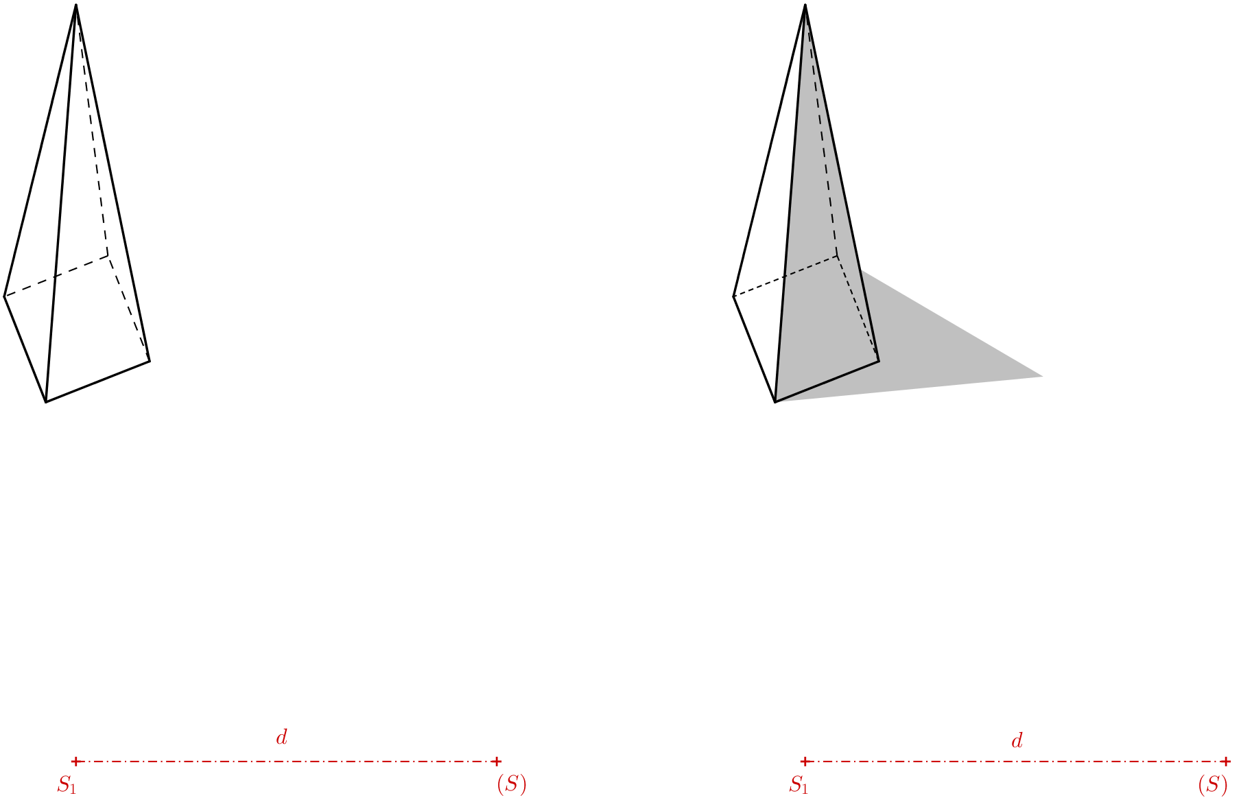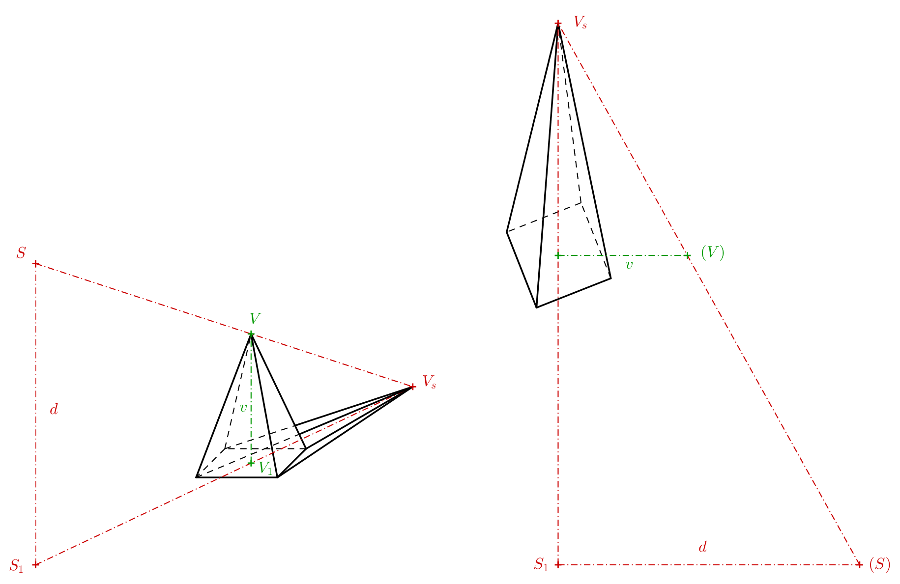 Probablemente sea más fácil crear imágenes anamórficas de una pirámide y un cono, siempre que sus bases se encuentren en los planos de proyección. Expliquemos el principio en una pirámide. Además del cuerpo, es necesario especificar el centro de proyección \(S\) y su proyección perpendicular sobre el plano de proyección \(S_1\). Podemos imaginar el centro de proyección como el ojo del observador. La proyección perpendicular es el lugar donde se sitúa el observador. La distancia \(S _1S = d\) es, por lo tanto, la distancia del centro de proyección al plano de proyección. Para una pirámide tetraédrica regular, denotamos de forma similar su vértice como \(V\) y la proyección perpendicular del vértice sobre el plano de proyección \(V_1\). La intersección de la línea \(SV\) (el llamado rayo de proyección) con el plano de proyección se obtiene entonces como la intersección de la línea \(SV\) con la línea \(S_1V_1\) (véase la siguiente figura a la izquierda). Es recomendable esbozar una imagen de este tipo al pensar en cómo funciona la ilusión y cómo se verá la proyección central. Sin embargo, esta imagen espacial no es necesaria para determinar la anamorfosis de la pirámide.