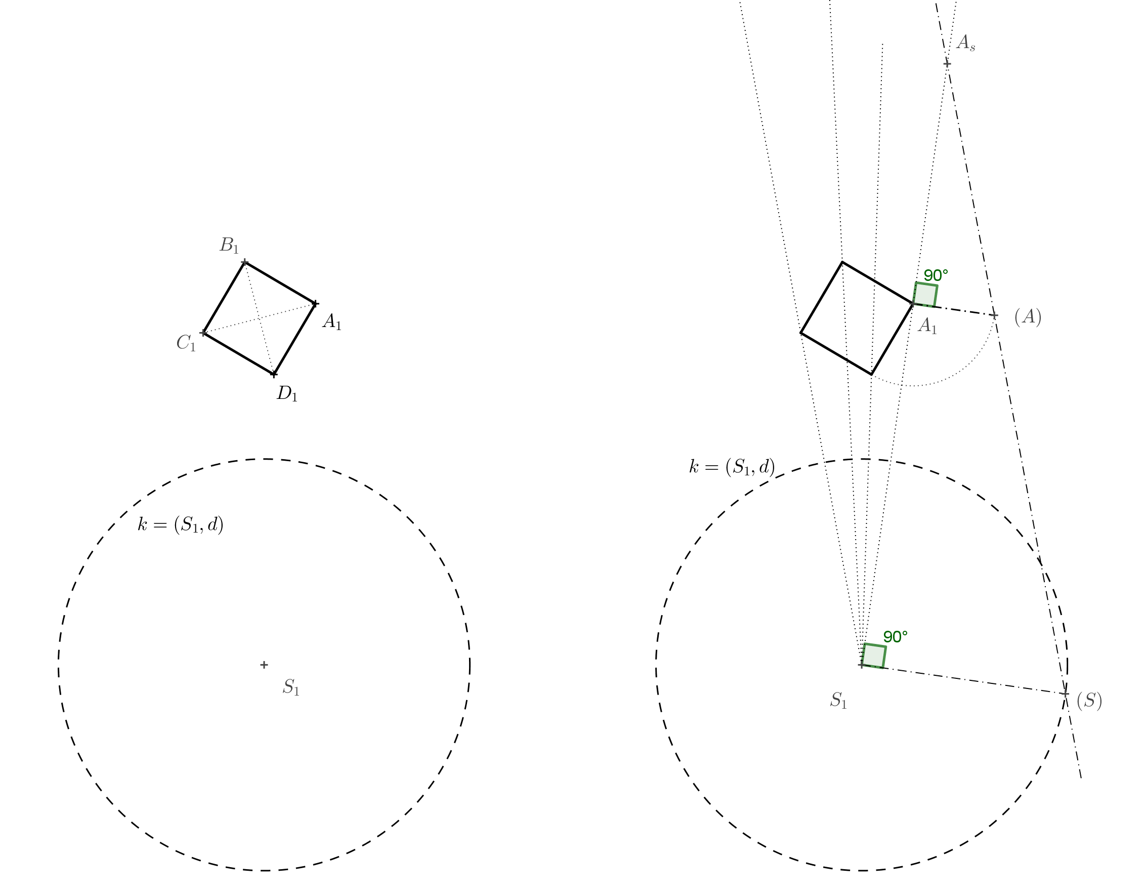 Solución. Construimos un cuadrado \(A_1B_1C_1D_1\) con diagonal \(A_1C_1\). En la figura, vemos que el punto \(A_s\) es la intersección de las rectas \(AS\) y \(A_1S_1\). Conocemos las longitudes de los lados paralelos del trapezoide \(A_1S_1SA\), por lo que alredededor del lado \(A_1S_1\) podemos rotarlo \(90^\circ\) con respecto a la proyección. La longitud \(S_1(S)=d\) viene dada por el radio del círculo \(k\) y longitud \(A_1(A)=a\) es la longitud del lado del cuadrado \(A_1B_1C_1D_1\). El punto \(A_s\) es la intersección de la recta \(S_1A_1\) y la recta \((S)(A)\).