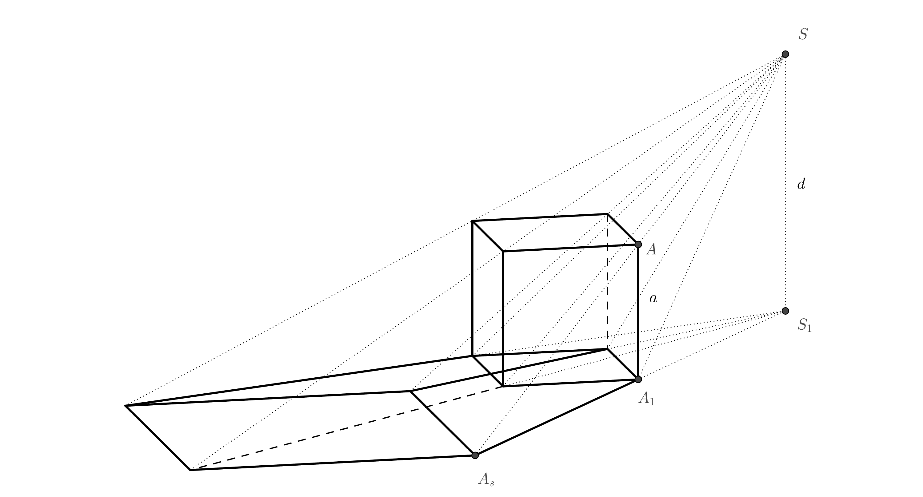 El cuadrado con vértice \(A_s\) se dibuja entonces utilizando equilateralidad. Las aristas del cubo corresponden a los vértices de los cuadrados que se corresponden entre sí en equilateralidad. Hemos terminado. Sin embargo, si queremos reforzar la ilusión de un cubo, podemos dibujar otro cuadrado que corresponda al cuadrado \(A_1B_1C_1D_1\) en equilateralidad con centro \(S\) y coeficiente \(0<k<1\). Si lo coloreamos de gris, determinaremos la sombra del cubo (cuando la dirección de la iluminación sea superior) y crearemos la impresión de que el cubo levita en el espacio.