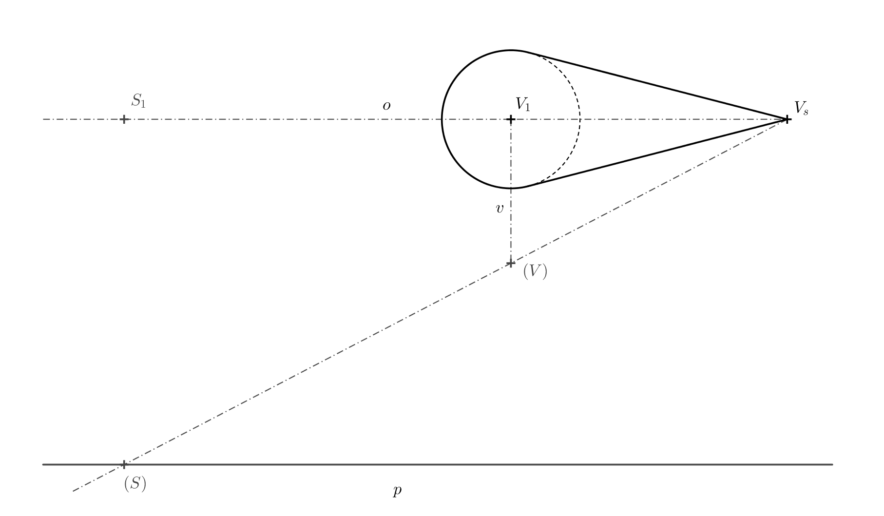 Tarea 3. Para resolver el problema anterior, determine la posición del centro de \(S\) (usando \(S_1\) y \((S)\)), si conocemos la altura \(v\) del cono espacial y \(d=\left|S_1S\right|\). Mira la siguiente figura para la tarea; las longitudes \(v\) y \(d\) están dadas por líneas.