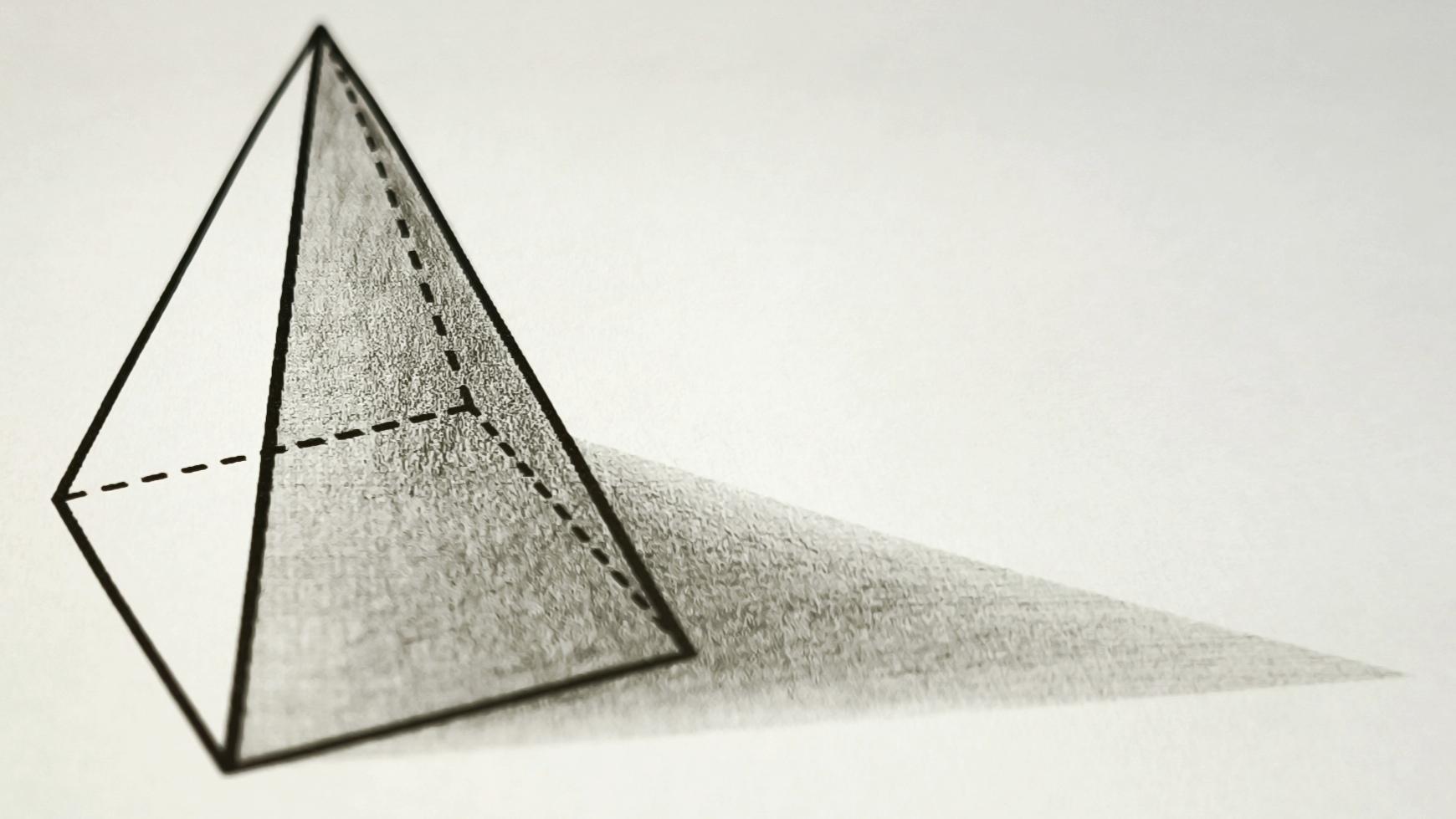 El resultado (ver la imagen anterior a la izquierda) se dibuja mejor sin líneas auxiliares. Podemos observarlo a través del ojo de la cámara. Al observar a través del ojo de la cámara, observamos que los bordes invisibles de la base inferior se dibujan mejor con una línea discontinua más densa que la proyección del borde lateral invisible. Para que la pirámide parezca creíble, sombreamos la imagen. Solo podemos estimar la sombra; podemos elegir la sombra proyectada por la cima. La anamorfosis de la pirámide está completa; para que la ilusión funcione, la cámara de la cámara debe estar colocada sobre el punto \(S_1\) a una altura igual a la distancia\(S_1(S)\). La imagen resultante, vista a través del ojo de la cámara, debería ser similar a la siguiente imagen.