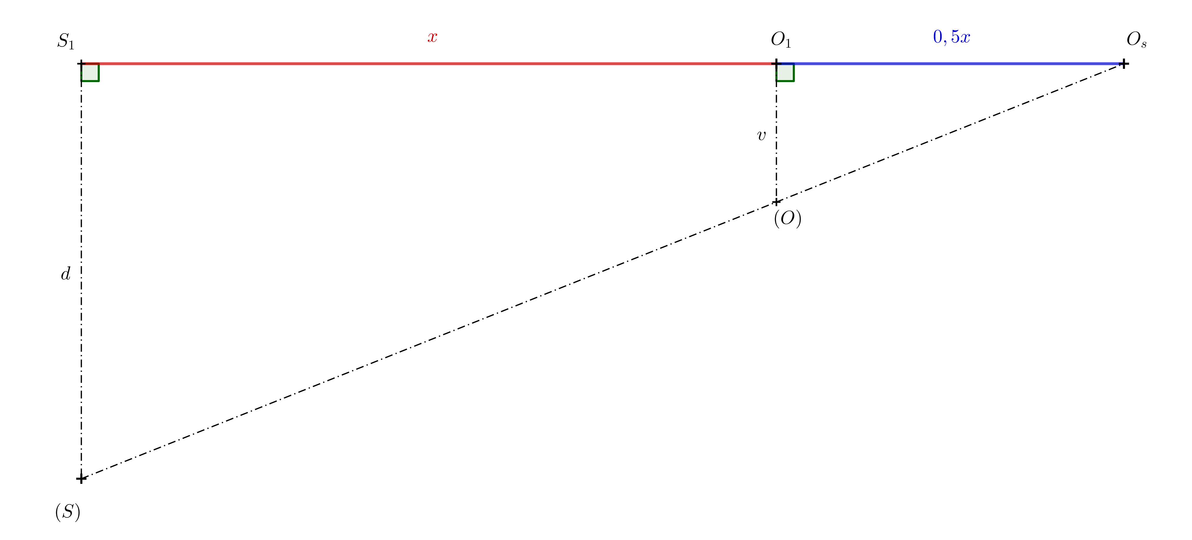 Solución. Señalemos \(x=\left|S_1O_1\right|\). Gracias al coeficiente de similitud, sabemos que \(\left|S_1O_s\right|=1{,}5\,x\). Esto implica que \(\left|O_1O_s\right|=0{,}5\,x\). Luego, volvemos a usar la similitud de los triángulos \(S_1O_s(S)\) a \(O_1O_s(O)\)en la siguiente figura.