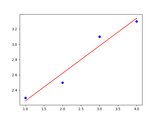 El sistema de ecuaciones (3) tras sustituir estos valores tiene la forma \[ \begin{aligned} 30a+10b&=29{,}8,\cr 10a+4b&=11{,}2. \end{aligned} \] La solución de este sistema es \(a=0{,}36\) y \(b=1{,}90\). La recta de regresión para los datos dados es, por lo tanto \[ y=0{,}36x+1{,}90. \] La figura muestra la recta de regresión y los datos dados.