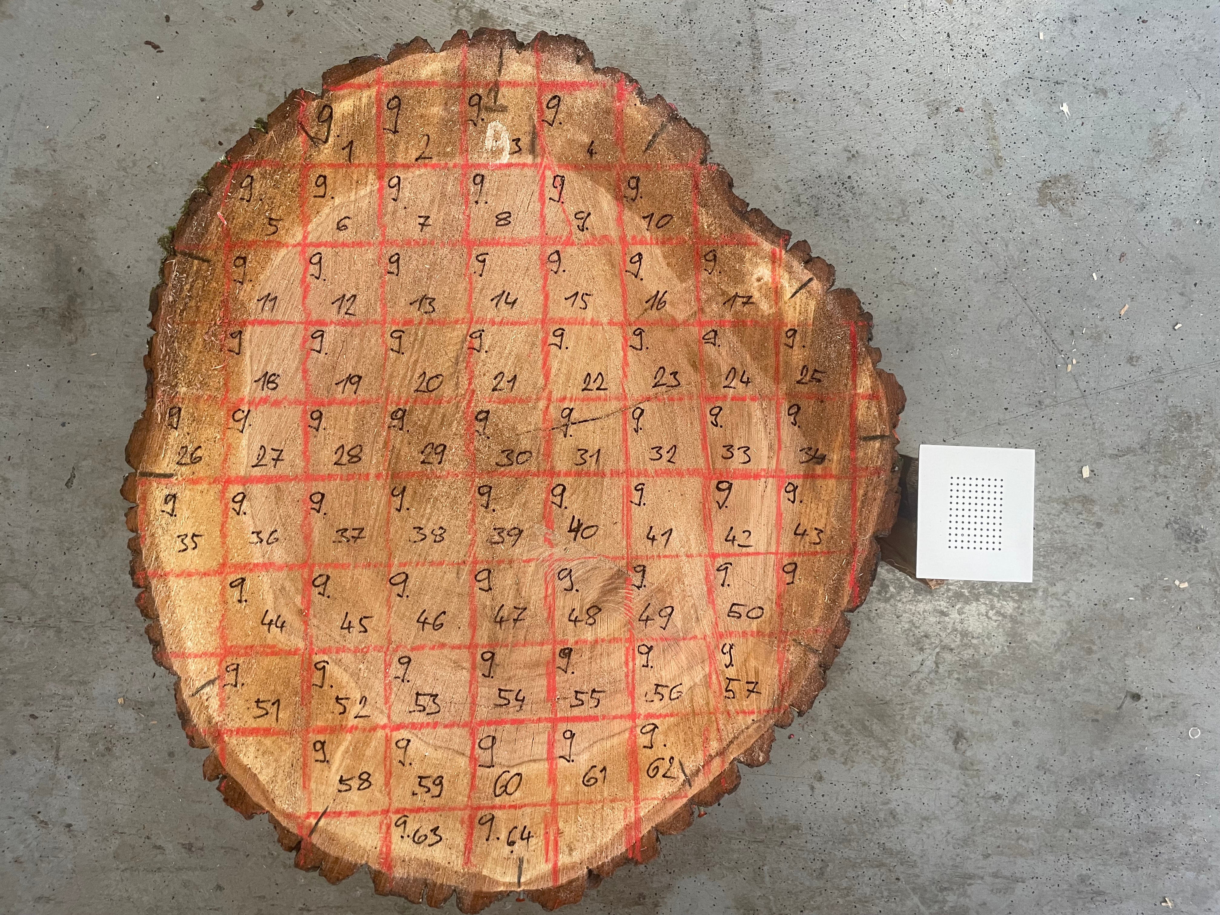 En la práctica de un arborista, especialista en el cuidado de árboles fuera del bosque, una tarea frecuente es evaluar la vitalidad y la salud de un árbol. Esto debe realizarse con mínima o nula intervención que no afecte significativamente su estado. Uno de los pocos métodos invasivos es el uso de un tomógrafo acústico. Este dispositivo mide el tiempo de vuelo de una señal sonora (el término inglés time of flight, TOF) entre dos sensores. Mediante métodos de geometría analítica, es posible determinar la distancia entre los sensores y, asumiendo la propagación de la señal sonora en rayos directos determinar la velocidad de propagación del sonido en el material. Este valor es un indicador muy importante de las propiedades físicas y mecánicas, ya que el sonido se propaga más rápido en madera sana (en inglés sound wood) que en madera degradada (en inglés degraded wood).