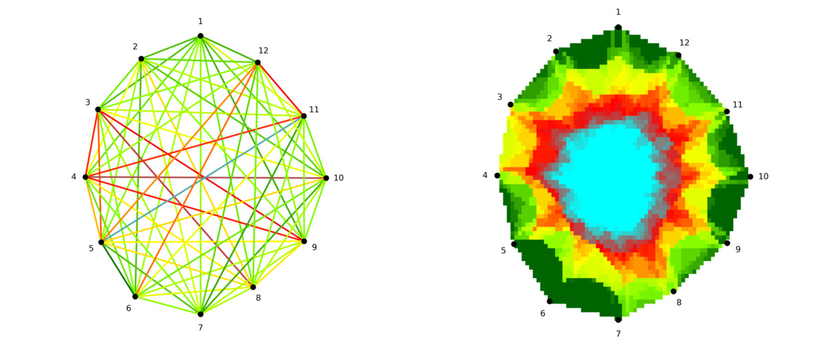 donde \(\vec u = (u_1, u_2)\) y \(\vec v=(v_1,v_2)\). Este cálculo se puede realizar muy rápidamente en computadoras y, mediante técnicas de programación adecuadas (vectorización), se puede realizar simultáneamente para miles de puntos, con una velocidad cien veces mayor que utilizando un ciclo basado en pruebas sucesivas de puntos individuales.